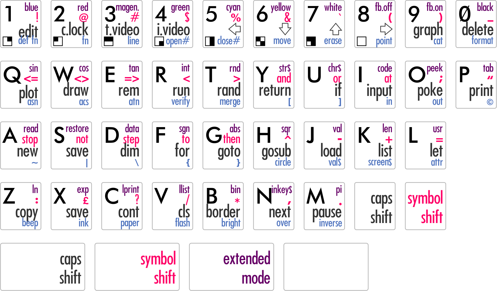 Отличие от версии DimkaM: помимо дизайнерских ухищрений изменил символы псевдографики, в оригинале они не инвертированные; добавил # в операторы open и close; добавил режимы как на оригинальной клавиатуре fb.on fb.off на клавишах 8,9; добавил названия цветов на цифровых клавишах;